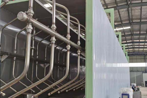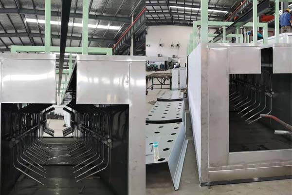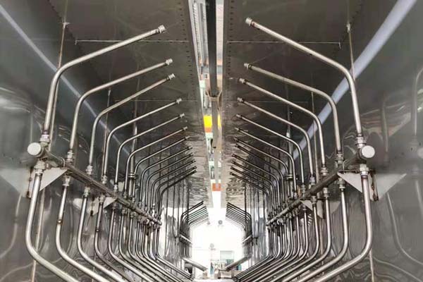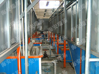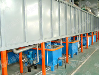 前處理生產(chǎn)線結(jié)構(gòu)特點(diǎn)是:前處理生產(chǎn)線各工序噴淋管布置在隧道內(nèi),噴淋由各液槽的泵來提供.各工序間都有門洞板隔開,以防竄液.各加熱液槽的加熱形式有槽內(nèi)和槽外。內(nèi)加熱器有排管、蛇形管、波紋板等;外加熱器有列管、板式加熱器等。加熱介質(zhì)有熱水 、蒸汽、導(dǎo)熱油等。在脫脂、磷化工序分別設(shè)有除油系統(tǒng)和除渣系統(tǒng)。為防止各加熱段隧道頂部及門洞處溢出蒸汽,在隧道頂部設(shè)有排風(fēng)機(jī)。
